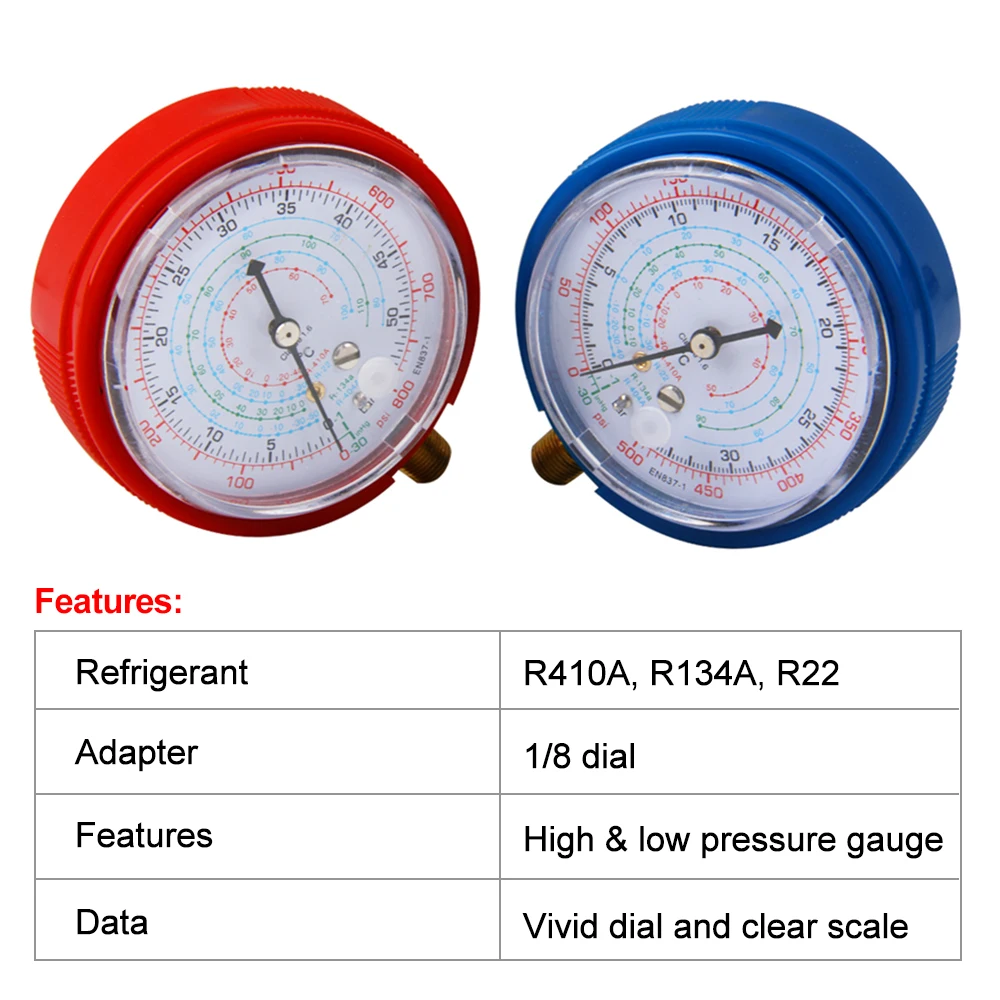R410A, R134A, R22 refrigerant pressure gauge(the pictures just show R410A).High & low pressure gauge.Vivid dial and clear scale, easy to read the data.